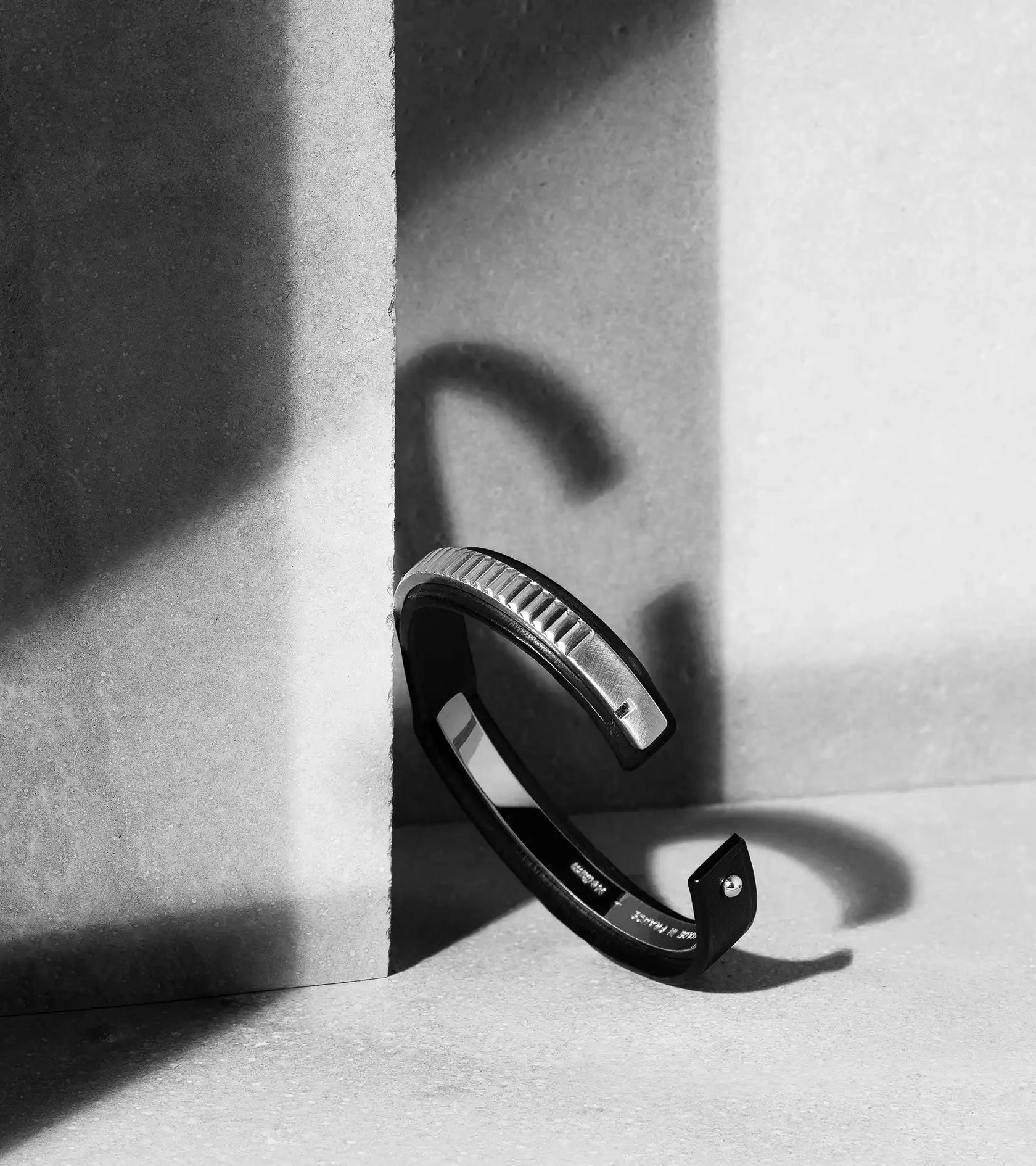 Nuestra colección se estructura en dos grandes diseños. LE JONC, reinterpretación del brazalete rígido clásico en plata maciza, se lleva abierto por encima o por debajo de la muñeca. SATURNE, más arquitectónico, es un modelo cerrado con un sistema invisible de botón de cuello. Disponible en varias anchuras y colores —incluido negro o plateado—, cada pieza se fabrica en Francia con precisión y pureza de línea.